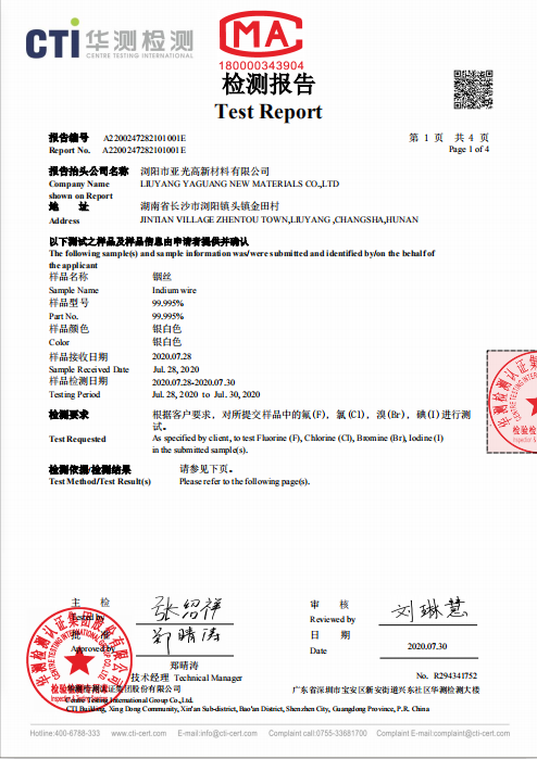 我公司是一家專業(yè)生產(chǎn)銦制品的廠家,通過了SGS認證,經(jīng)CTI華測檢測,質(zhì)量好,放的心的產(chǎn)品,歡迎前來洽談采購!